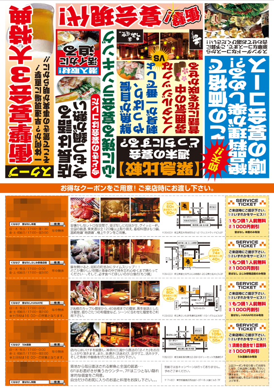 居酒屋に行きたくなる両面フルカラーずらし印刷の宴会ずらし折りチラシ。お店の特徴と希少性の高い情報が一目で理解できるようにレイアウトはシンプルに作成、ブロックごとに情報をカテゴライズしてみました。 宴会のコースのご案内と楽しい企画、得点をシンプルにまとめています。来店を促すクーポン券にはお得な情報とお店の雰囲気とメイン料理が伝わる写真・地図を掲載しクーポンを利用してもらいやすい工夫をしています。配色は様々なカラーを入れる事でお店のにぎやかな雰囲気を伝えています。 特に明るいオレンジ色にこだわり、最も親しみを感じるカラーでチラシを手にした人がお店に親近感が持てるように設計しました。宴会ならではのにぎやかなイメージがこのチラシのテーマです。